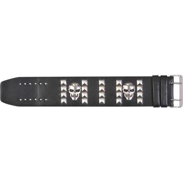 • Real leather wristband in black with rivets and skulls made of chromed metal.